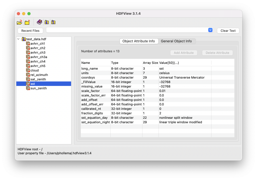 Sometimes it’s useful to use other software packages in tandem with the CoastWatch Utilities to view data file contents. We recommend the HDFView software to view raw NetCDF and HDF file metadata and scientific values as a table of numbers or an image: