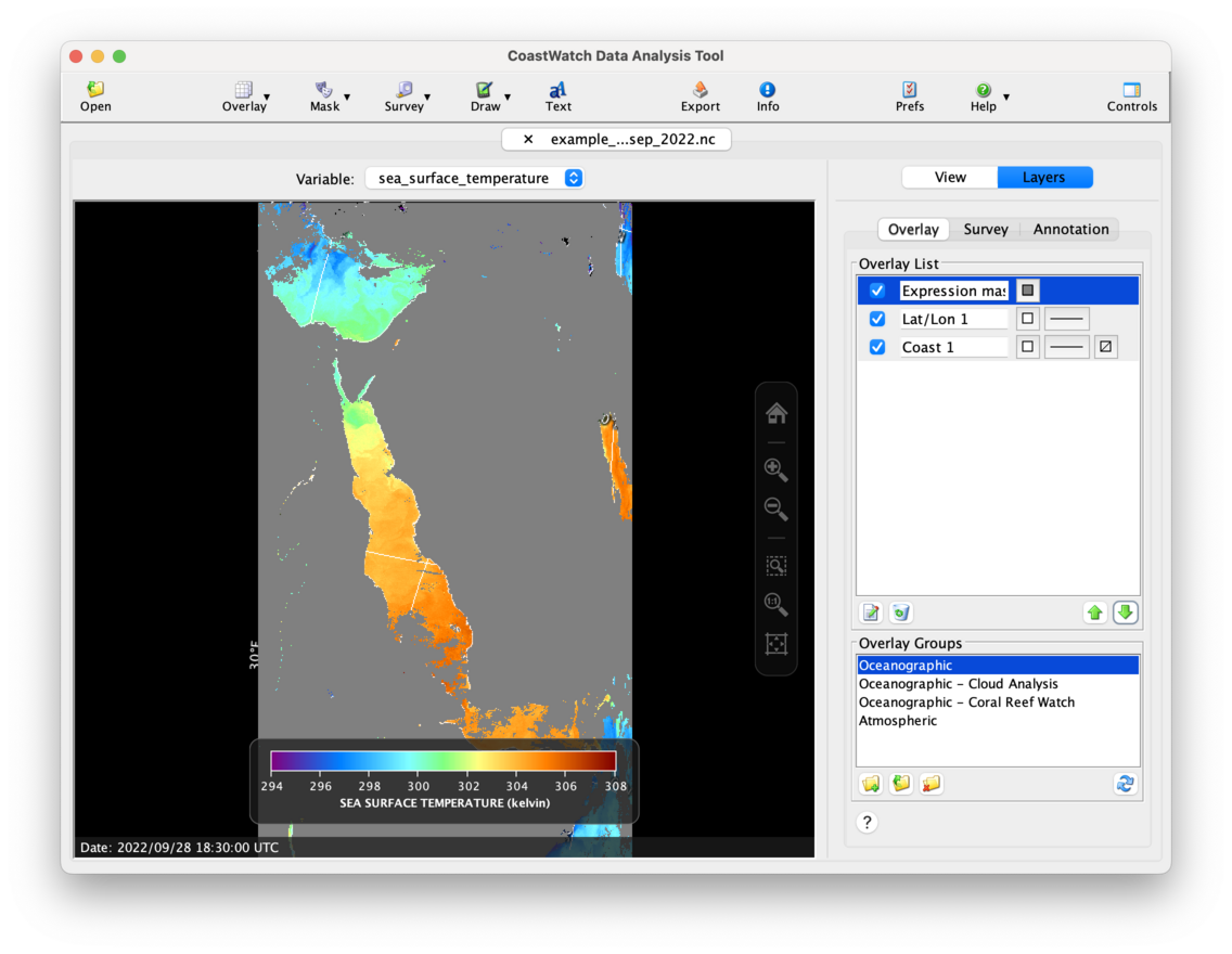 The data view is more useful now but doesn’t look correct. The mask data is rendering on top of the coast and grid lines. The Overlay list shows the overlay layers as if they’re a stack, rendered from bottom to top. Try rearranging the overlays by selecting an overlay (click on its right side) and use the