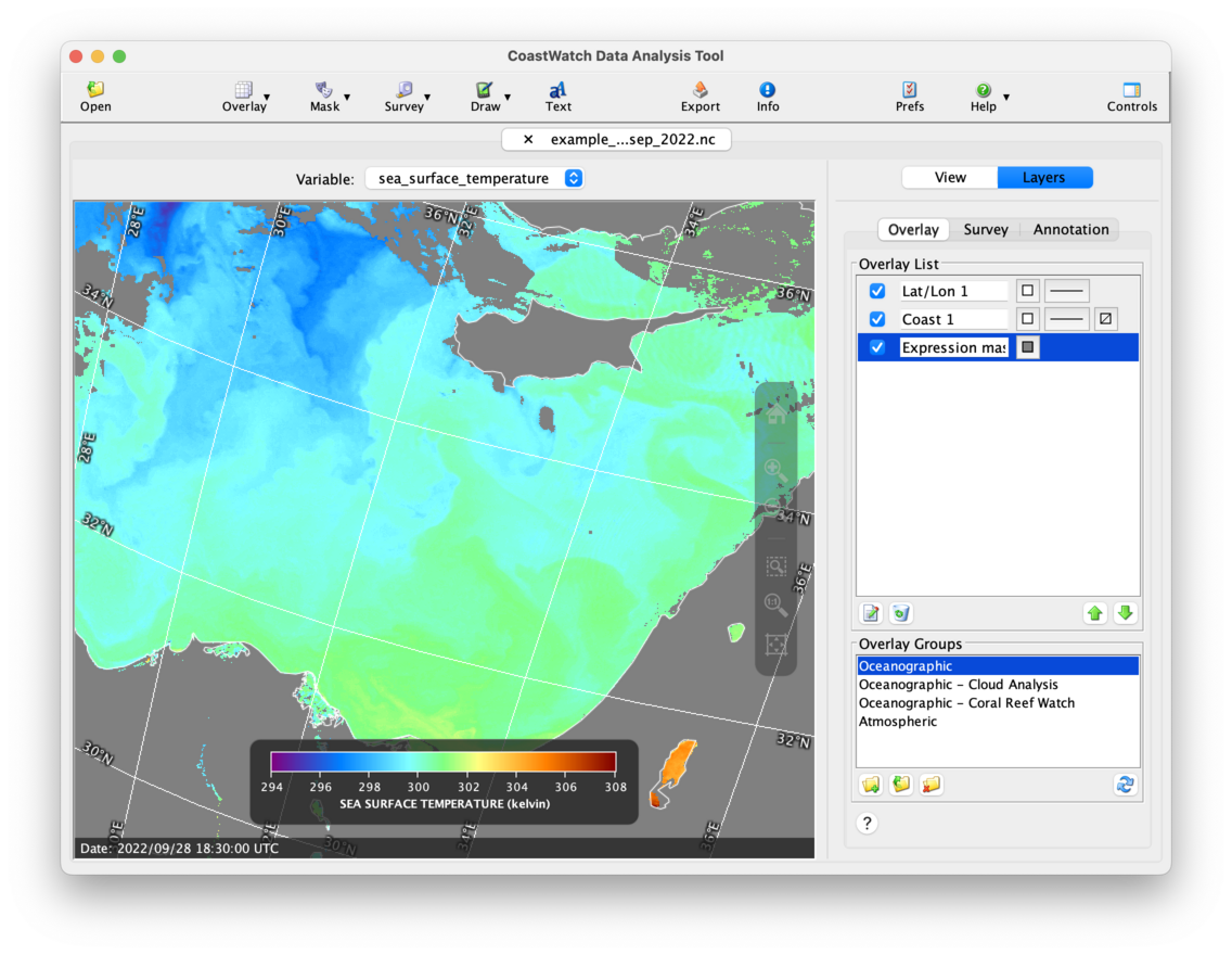 Zoom to actual size to magnify the data view. Try zooming in on the Eastern Mediterranean Sea: