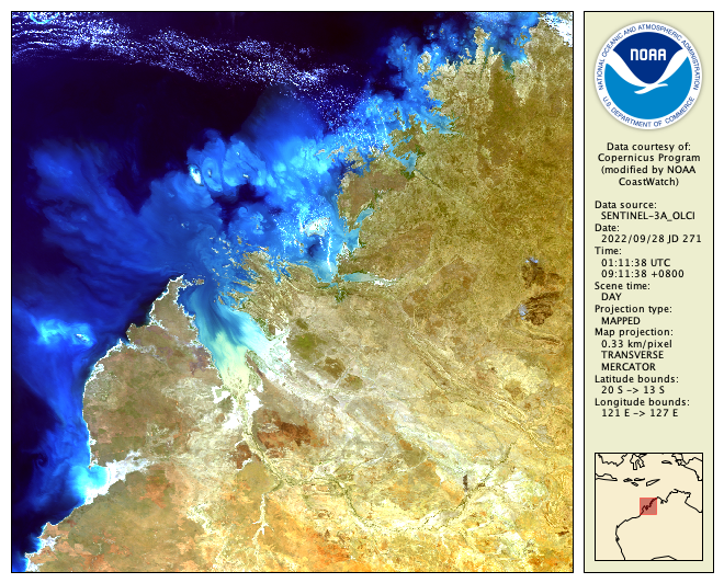 - Try rendering the OLCI data using one of the command lines above but at full resolution using a magnification option, for example