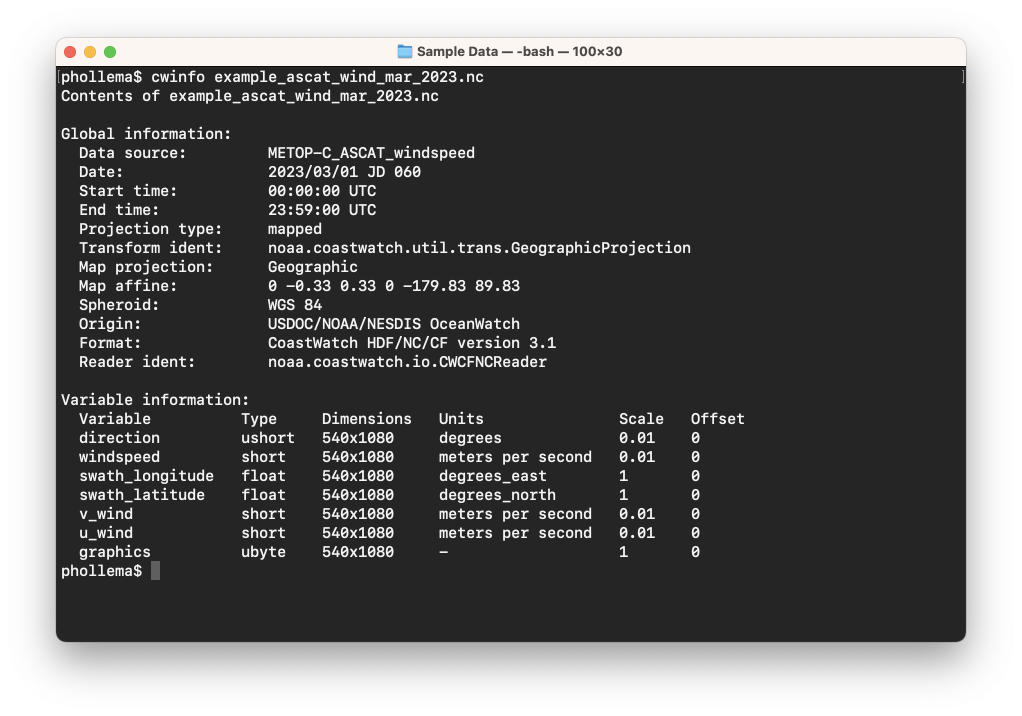 Let’s look at the surface wind data file example_ascat_wind_mar_2023.nc which contains data from the MetOp-C satellite Advanced Scatterometer (ASCAT) instrument. The instrument uses radar to measure backscatter to determine speed and direction of winds over the surface of the oceans. Take a look at the file contents with cwinfo:
