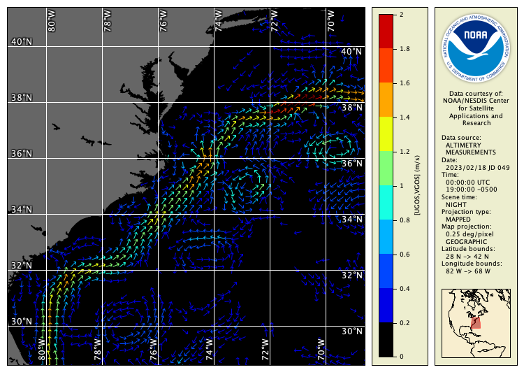 cwrender --enhance ugos/vgos --magnify 35/-75/10 --background black --palette Blue-Red --range 0/2 --function step10 --coast black/gray40 --grid white example_altim_surface_curr_feb_2023.nc nw_atlantic_currents.png
