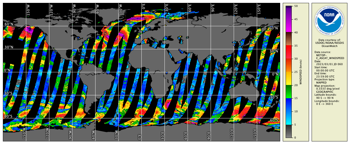 cwrender --enhance windspeed --palette Wind-0-50 --range 0/50 --units knots --coast black/gray40 --grid white example_ascat_wind_mar_2023.nc windspeed.png