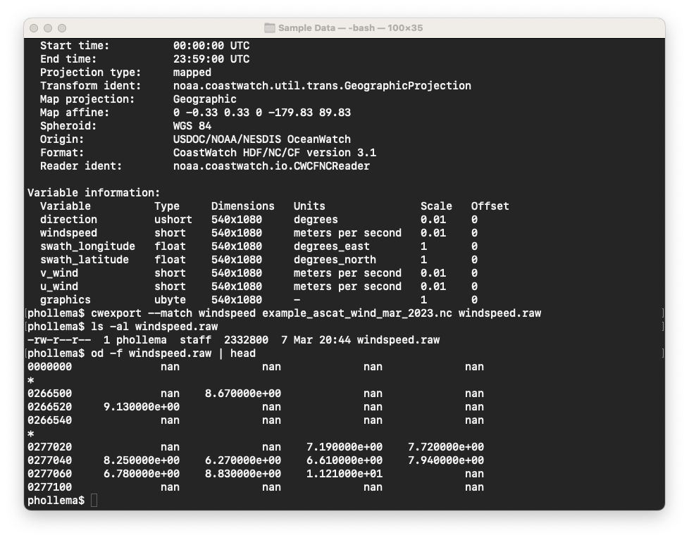 You can see above that the output file windspeed.raw has the expected size of 540 x 1080 x 4 = 2332800 bytes. A dump of the binary file contents (using the Unix od command) shows many NaN (Not a Number) values with some valid windspeed values (8.67 m/s, 9.13 m/s, …) just as in the original NetCDF file. Now try the same thing with a text output file and check the results: