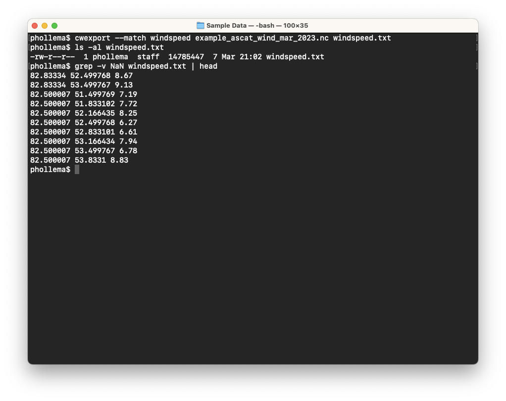 Take for example the MetOp-C ASCAT wind data file example_ascat_wind_mar_2023.nc — suppose we need to import the windspeed data into an analysis software package without using NetCDF format. Try exporting the windspeed to a 32-bit float data file: