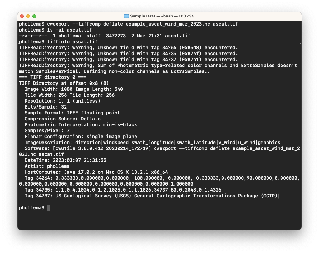 example_amsr_ice_conc_jan_2022.ncdata file to a GeoTIFF using no TIFF compression. Verify using thetiffinfocommand. - Look at the examples in the cwexport man page to get ideas for other types of data exporting.