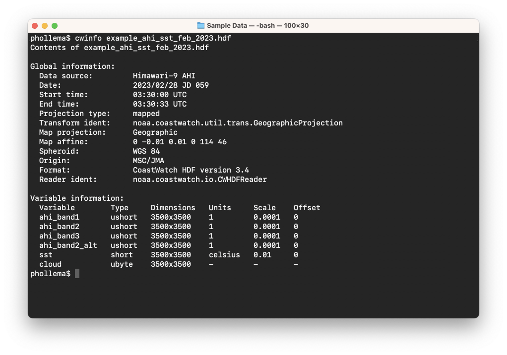 --bath black/100/200/500/1000/2000/5000. - Read the Unix man page or the user’s guide entry for the hdatt tool (part of the CoastWatch Utilities, but not covered in this module). Use the example in the manual page to dump the global metadata of the Himawari-9 HDF data file. You can see some of the commands and equations used to create the data file.