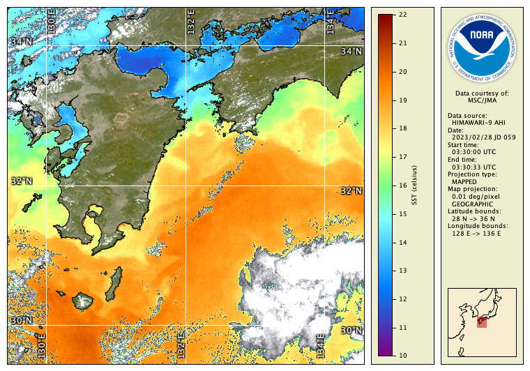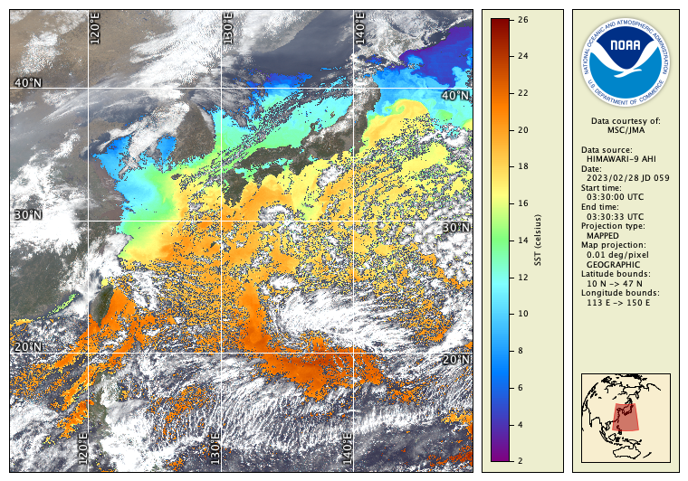 The cwrender tool can create a hybrid of a color enhancement and a color composite, using the options for both. For example, we’ll use the Himawari-9 Advanced Himawari Imager (AHI) data file which contains data from some of the visible AHI bands, as well as SST data derived from the thermal bands: