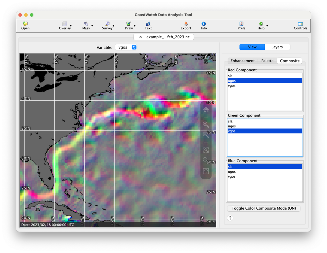 Color composite mode is an alternate way of deriving the color values at each pixel — it combines data from three different variables to form the pixel colors. Read through the command line exercises on Color Composite Images for background and examples on how this is done.