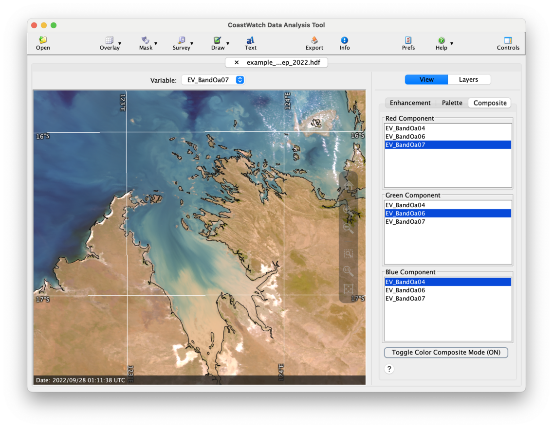 - Click the Help or ? button at the bottom of the color composite tab and read the CDAT in-application help on composites.