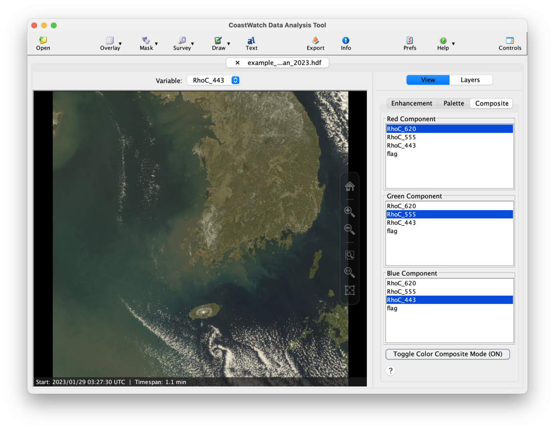 For this exercise we’ll use the GK-2B Geostationary Ocean Color Imager II (GOCI-II) sensor data file example_goci2_reflect_jan_2023.hdf, and create a composite image as follows: