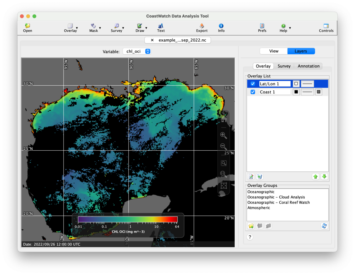 Now, open the VIIRS chlorophyll data file, select the chl_oci variable, and zoom in on the Gulf of Mexico. After adding some coasts and lat/lon lines, you should see a CDAT window similar to the following:
