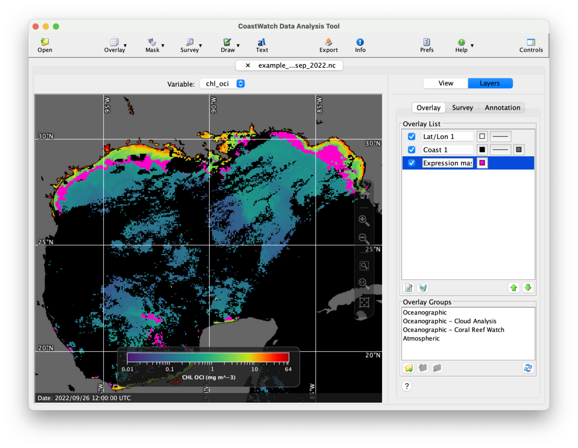 You should now see the following screen that highlights all chlorophyll values in the range 1.0 ± 0.5 mg/m3: