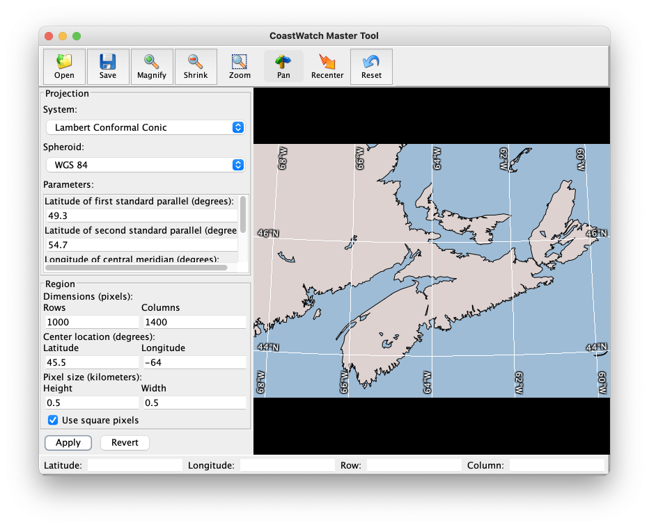 - Tool bar — Open and save master projection templates, change the region parameters interactively, and reset to the original Mercator projection.