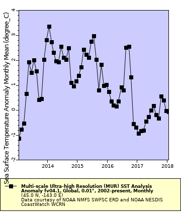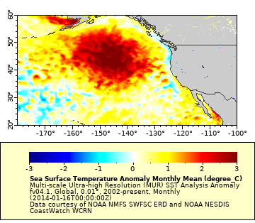 This exercise examines the marine heatwave that was observed in the North Pacific Ocean off the west coast of North America, also know as The Blob. It was first detected in late 2013 and continued to spread throughout 2014 and 2015.