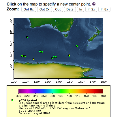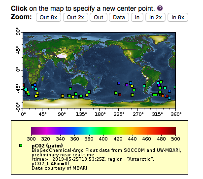 Let’s make a map of all floats in Antarctica which have pCO2 data and that have reported in the for a one month time period from May 25, 2019 to June 25, 2019.