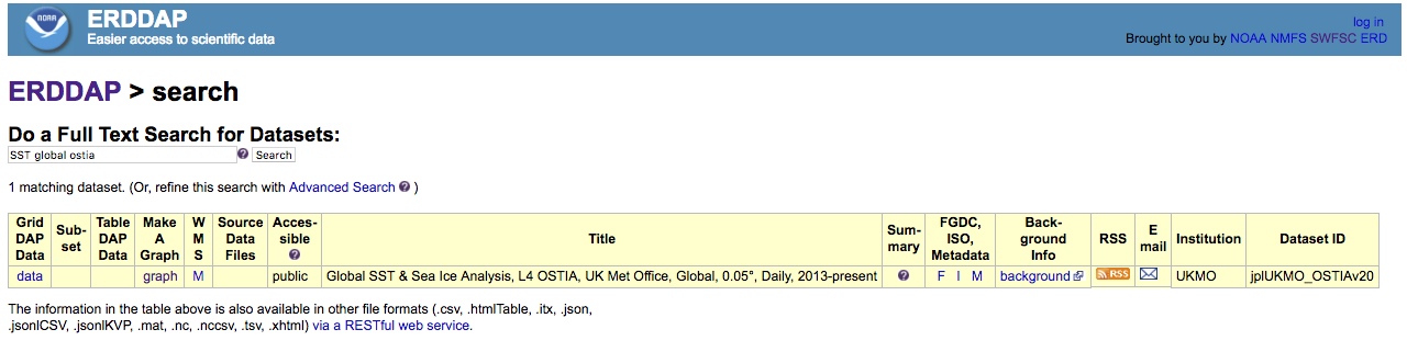 Make sure you are on the search results page you generated in Chapter 1 by entering “sst global ostia” in the ERDDAP search box or by putting the following link in a browser: https://coastwatch.pfeg.noaa.gov/erddap/search/index.html?page=1&itemsPerPage=1000&searchFor=ID+%3DjplUKMO_OSTIAv20