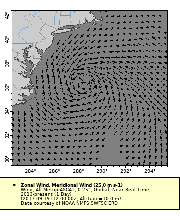 Hurricane Jose formed on September 5, 2017 and, on September 8, it reached its peak intensity as a high-end Category 4 hurricane. Jose worked its way northward along the US East Coast, finally dissipating on September 25, 2017. In this exercise we will try to capture the hurricane event using wind data from the ASCAT instruments on board all EUMETSAT’s MetOp satellites. ASCAT is a microwave scatterometer designed to measure surface winds over the global ocean.