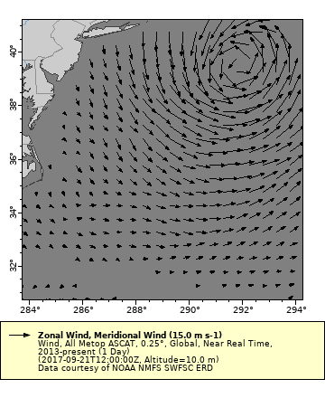 Move the time ahead 2 days to Sept. 21, 2017 (2017-09-21T12:00:00Z) and redraw the graph (map). Hurricane Jose has moved to the northeast. Hurricane Jose has weakened. Note that the arrow length legend has changed to equals 15 m/s.