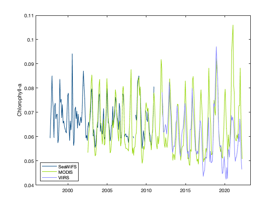 We are going to download data from SeaWiFS (1997-2010), MODIS (2002-present) and VIIRS (2012-present) and compare it to the ESA-CCI data which combines all 3 sensors into a homogeneous time-series.