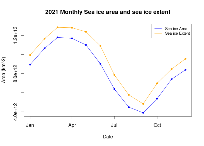 plot(dates,ext12,type='o',pch=20,xlab='Date',ylab='Area (km^2)', col="orange" , ylim=c(lower, upper), main="2021 Monthly Sea ice area and sea ice extent")