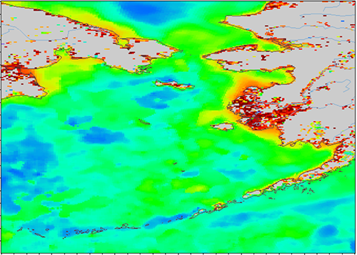 We will extract data for an area in the Bering Sea between Russia and the United States at 176°E to -152°E longitude and 50°N to 70°N latitude.