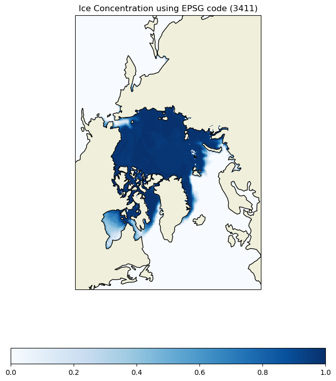 ax.set_title('Ice Concentration using EPSG code (3411)')