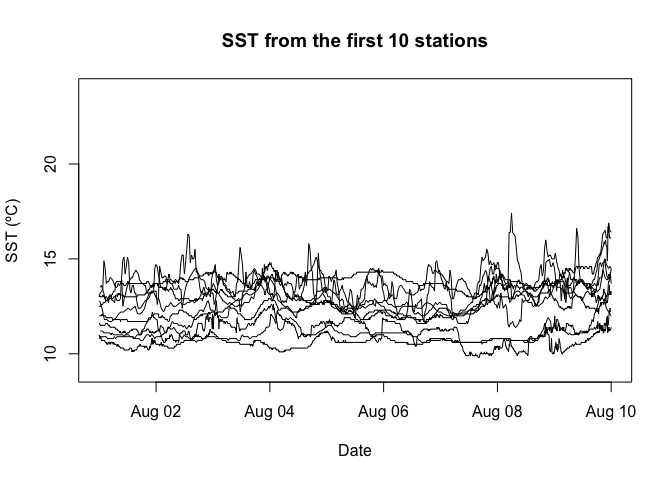 plot(buoy.df$time, buoy.df$temp, type='n', xlab='Date', ylab='SST (ºC)',main='SST from the first 10 stations')