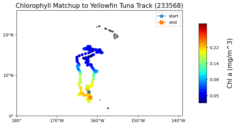 plt.title("Chlorophyll Matchup to Yellowfin Tuna Track (233568)", size=15)