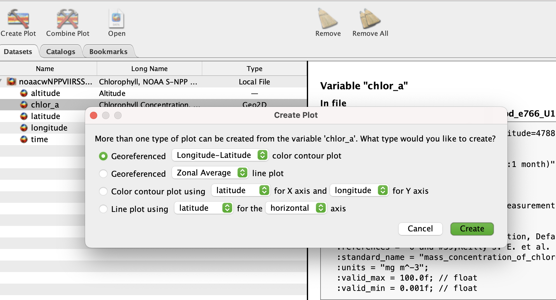 - On the leftside of the screen, double-click on the chlor_a variable. Keep the default settings and click Create.(this will take a minute, it’s a big file)