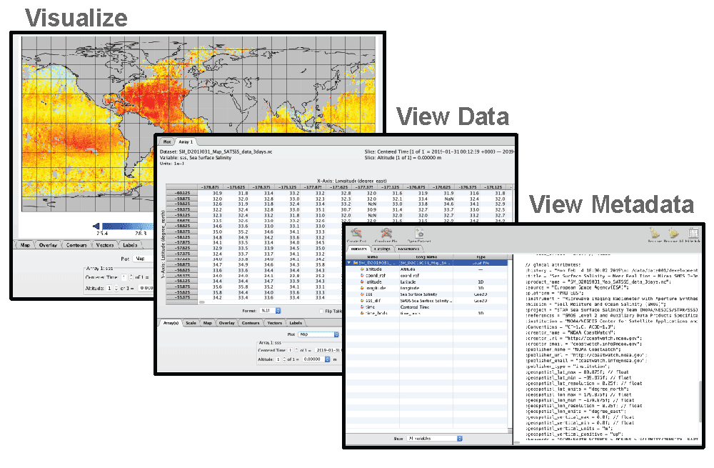NASA developed the Panoply viewer that allows users to view and visualize data held in NetCDF files. Some feature is the software include: