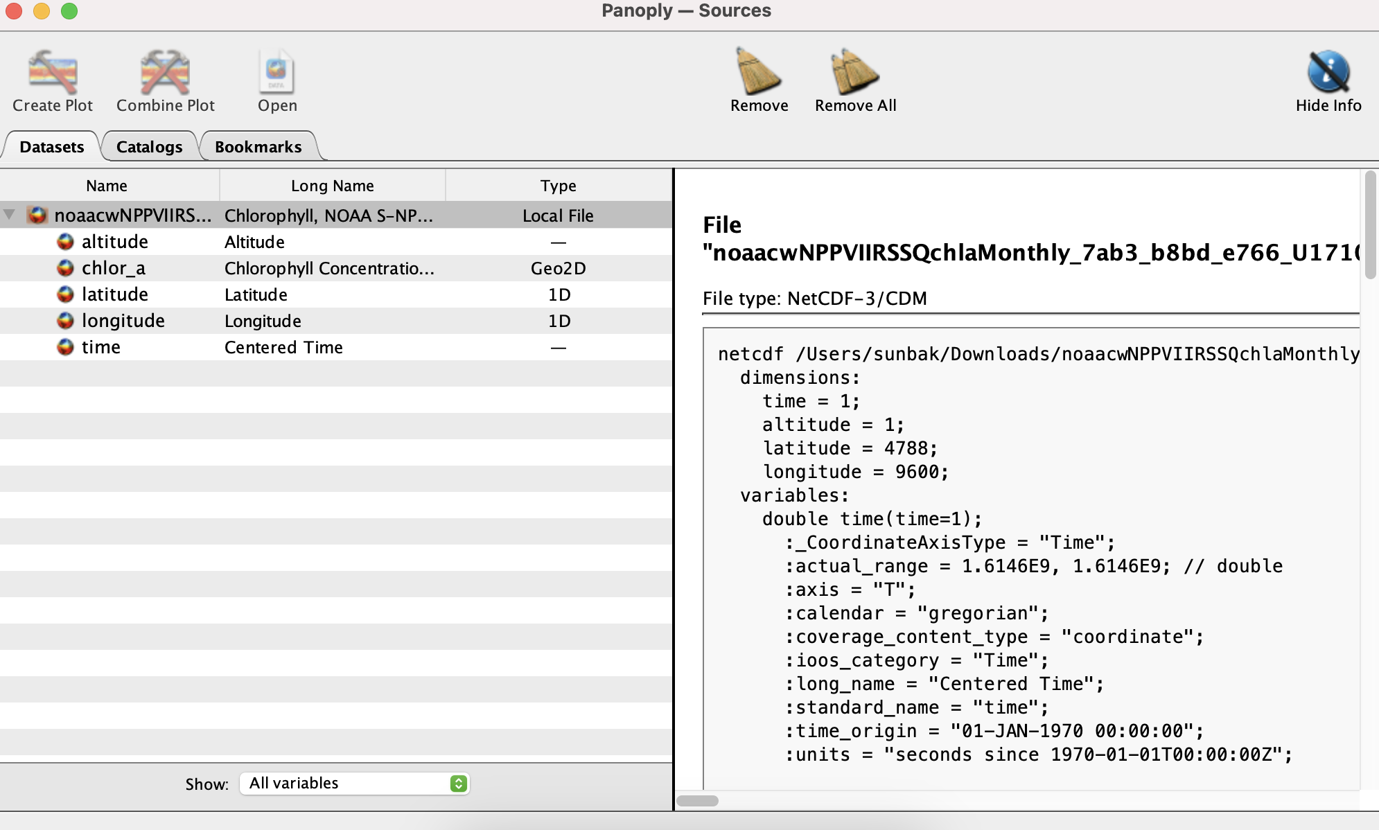 - On the left side, Panoply displays a list of the variables contained within the file, including time, altitude, longitude, latitude, and chlorophyll-a (chlor_a).
