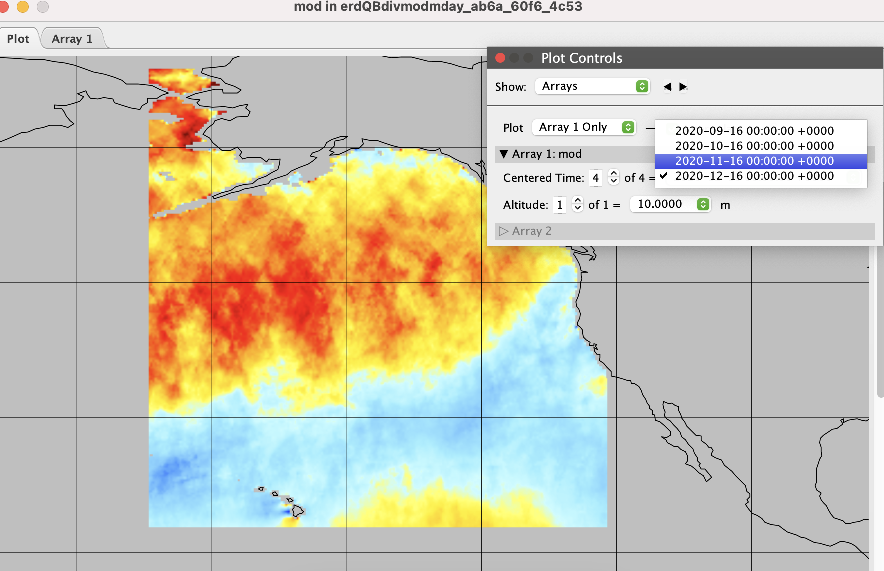- Download data from the West Coast ERDDAP using the following URL: https://coastwatch.pfeg.noaa.gov/erddap/griddap/erdQBdivmodmday.nc?mod[(2020-09-16T00:00:00Z):1:(2020-12-16T00:00:00Z)][(10.0):1:(10.0)][(17.75):1:(68.75)][(188.0):1:(239.0)]
