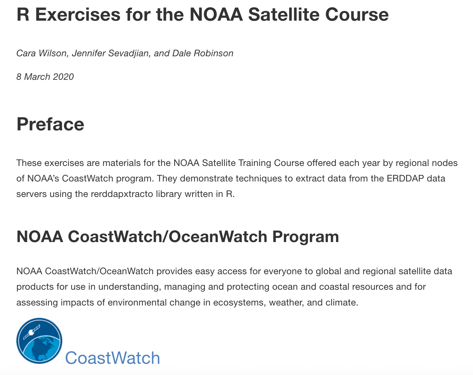 This page provides links to supplemental training materials and courses offered through NOAA CoastWatch and its regional nodes. Resources include R-based exercises from the NOAA CoastWatch West Coast Node that demonstrate how to extract and analyze ERDDAP data for applied fisheries and oceanographic research. Also included are CoastWatch satellite data courses designed to help scientists and managers incorporate satellite products into their operational workflows.
