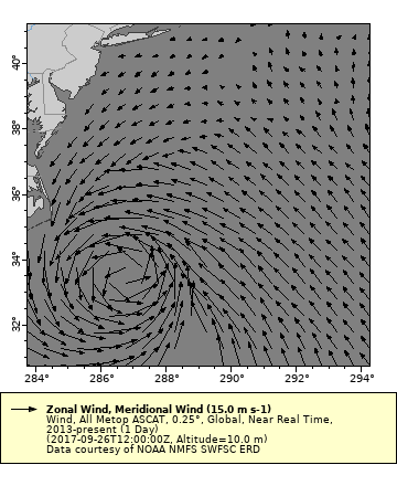 This tutorial demonstrates how ERDDAP can be used to visualize and analyze hurricane events using satellite-derived ocean surface winds from the ASCAT instruments. You will learn how to map both scalar wind speed and vector wind fields to identify storm structure, intensity, and circulation patterns during Hurricane Jose in September 2017. The exercise highlights ERDDAP’s ability to work with gridded wind data for mapping, vector visualization, and time-evolving analysis of extreme weather events.